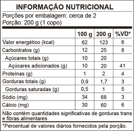 Ingredientes: Soro de leite pasteurizado e/ou soro de leite em pó reconstituído, leite pasteurizado integral e/ou leite em pó reconstituído, açúcar (sacarose), estabilizante (amido modificado e gelatina), preparado de fruta sabor pêssego (água, açúcar líquido invertido, polpa de pêssego, estabilizante amido modificado, aroma idêntico ao natural de pêssego, corante natural de urucum (INS 160b), acidulante ácido cítrico (INS 330), conservante sorbato de potássio (INS 202), corante artificial crepúsculo (INS 110l), fermento lático, citrato de sódio (INS 331III), aroma idêntico ao natural de pêssego e corante natural de urucum (INS 160b) .